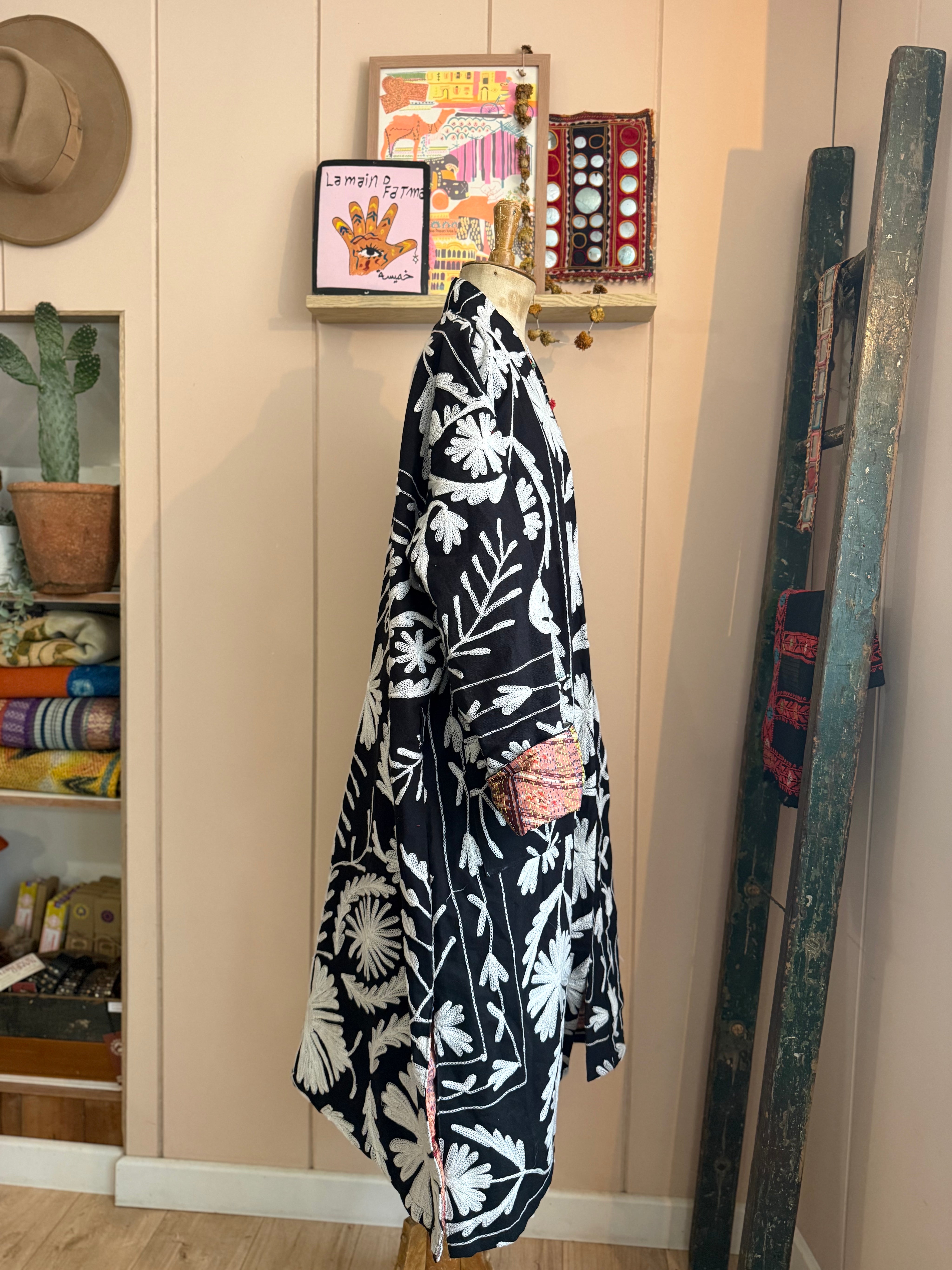 This reversible duster jacket is crafted from a beautiful wool cotton blend, offering warmth, softness, and timeless wear. One side features intricate Suzani embroidery, rich with heritage and hand worked detail. The other reveals a silk sari reverse, finished with traditional kantha stitching, each stitch carrying its own story.