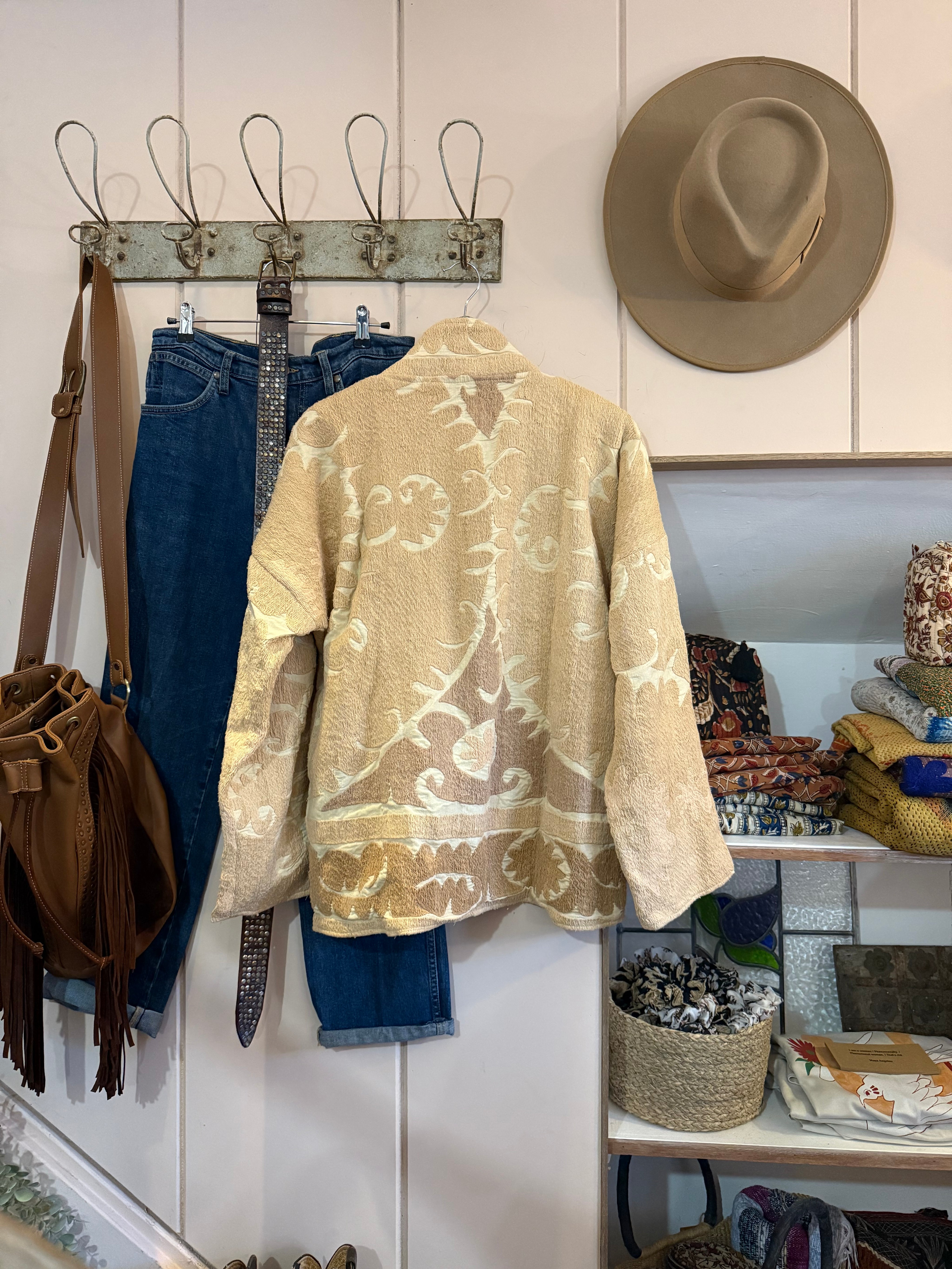 Every Talitha Jacket is a true one-of-a-kind. Each piece is hand-crafted from hand-picked antique Suzani quilts, celebrated for their intricate, hand-stitched florals and time-worn softness. The quilts are carefully sourced and reimagined into a relaxed, kimono-style jacket, so no two are ever exactly the same.