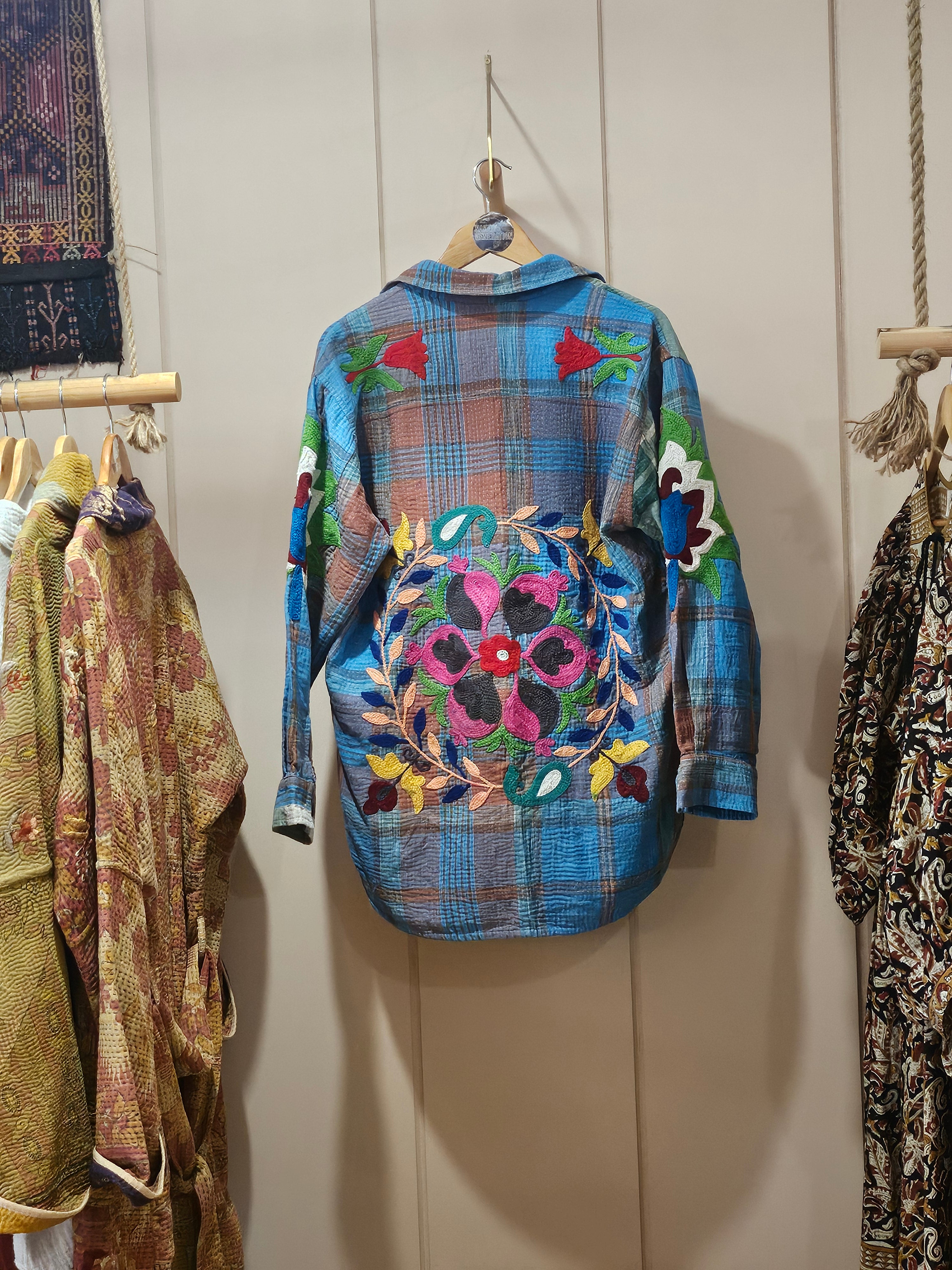 A tapestry of stories, stitched by hand. Each shacket is a living piece of art, pieced together from reclaimed fabrics, brushed with colour, and embroidered with the rhythm of many hands. No two are ever the same.