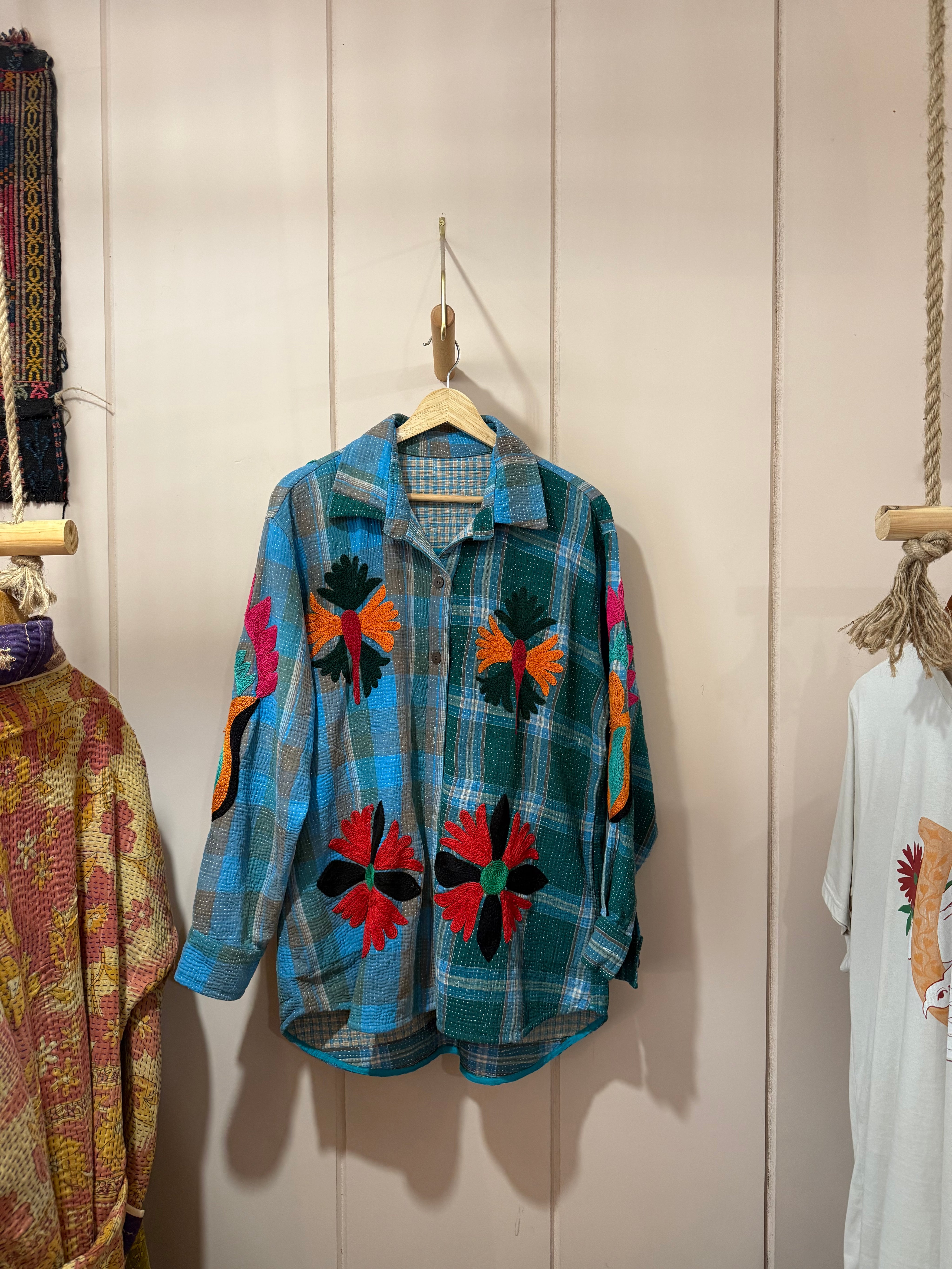 A tapestry of stories, stitched by hand. Each shacket is a living piece of art, pieced together from reclaimed fabrics, brushed with colour, and embroidered with the rhythm of many hands. No two are ever the same.